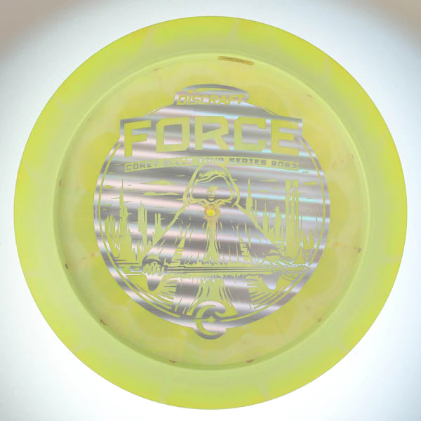 The Corey Ellis 2024 Tour Series Force is a disc that offers players the confidence to execute various lines on the course. The Force is an overstable distance driver with considerable glide. It's a favorite among players who have the power to throw hard and want a disc that can handle it all, including headwinds. Thrown forehand or backhand, the Force is a distance driver perfect for attacking the course.