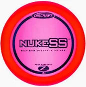 The Discraft Nuke SS is a disc golf distance driver with a stability rating of 1.6. It has a wide, heavy rim and aerodynamic engineering for unparalleled velocity. It is designed to be easier to turn for lower arm speeds. The Nuke SS is a flippy long distance driver that is good for players of many skill levels.