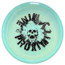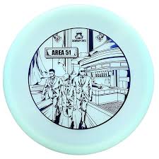 The Area 51 is an approach putter disc that is part of Doomsday Discs' Conspiracy Line. It is made of premium, durable, and somewhat stiff plastic with a sparkly finish and weighs between 170–175 grams. The Area 51 is stable and easy to control when thrown forehand or backhand, and has a similar flight to a Discraft Zone but with a shallower feel. It has a shallow profile and overstable finish that allows it to handle significant torque. The Area 51 is a good choice for confident approach shots, sidearm throws, and controlling your game.
