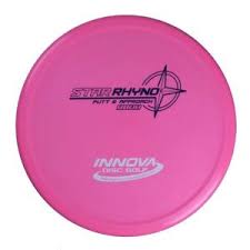The Rhyno is a putt and approach disc from Innova that's designed to handle headwinds and is good for players with a lot of throwing power. It has a flight number of 2 for speed, 1 for glide, 0 for turn, and 3 for fade. The Rhyno's overstable nature makes it ideal for short to medium up shots and putting into the wind, and it can also help you avoid overshooting the basket. The disc has a Thumbtac groove for better grip and controlled shots.