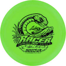 The Innova Racer is a distance driver designed for players who want to throw long distances with a smooth fade. It's intended for advanced and professional players, and can be used for both forehand and backhand flip-up lines. The Racer has a unique bottom wing design with a curved, beaded rim that helps it fly straight, even when thrown flat and hard. It's also said to decrease low-speed overstability while maintaining torque resistance